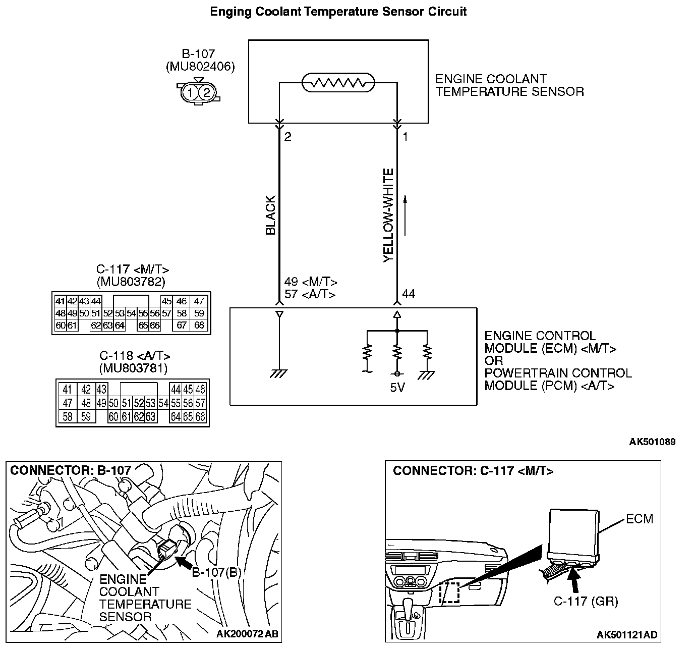 1. Disconnect the engine coolant temperature sensor connector B-107.