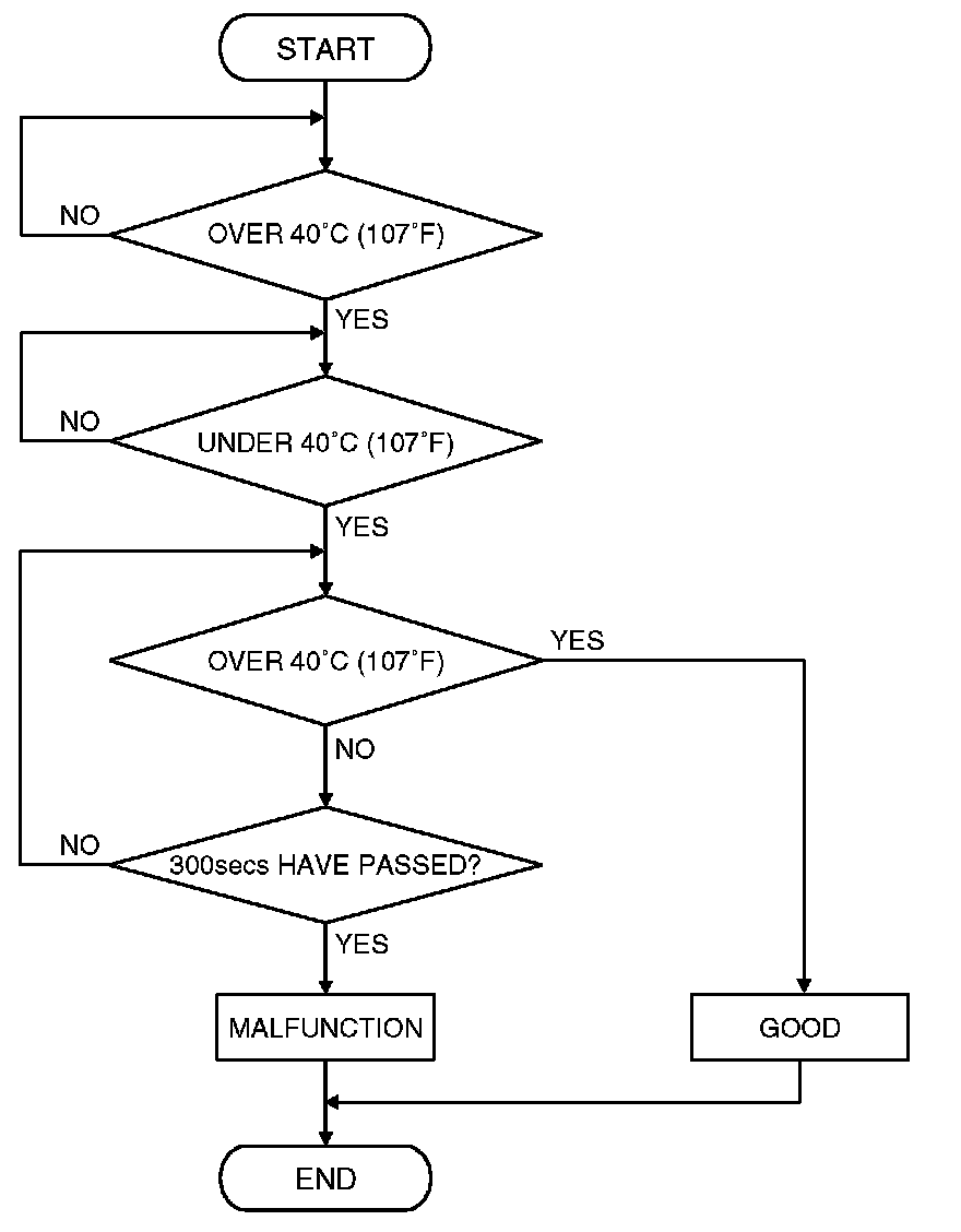 - If more than 5 minutes have elapsed after the engine coolant temperature sensor output has dropped from above 40 degrees C (104 degrees F) to below 40 degrees C (104 degrees F), the engine coolant temperature sensor is determined to have an abnormal output.