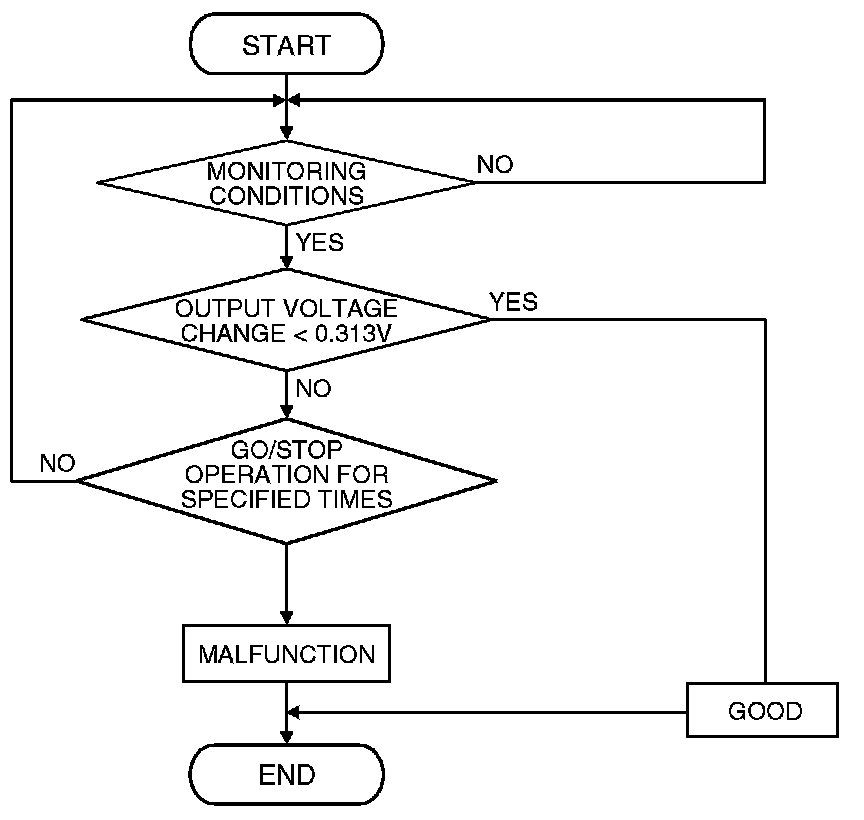 - Heated oxygen sensor (rear) output voltage does not change during specified go/stop operations including fuel cut are repeated.