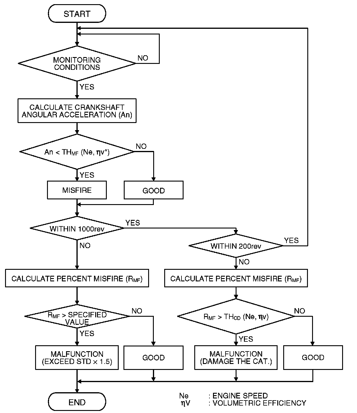 - Misfire has occurred more frequently than allowed during the last 200 revolutions [when the catalyst temperature is higher than 950 degrees C (1742 degrees F)].