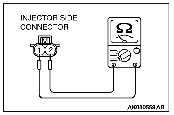 2. Measure the resistance between each injector side connector terminal No. 1 and No. 2.