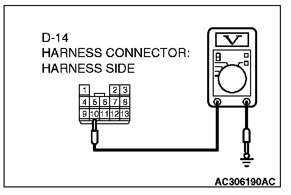 3. Measure the voltage between connector D-14 terminal 10 and ground by backprobing.