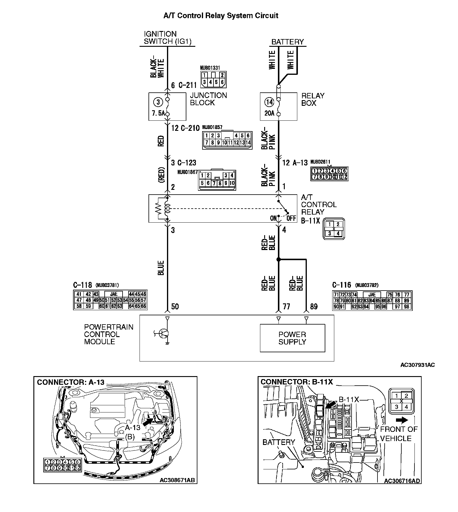 ^ When the ignition switch is turned to the "ON" position, the PCM (terminal 50) receives battery voltage from the ignition switch. The PCM (terminal 50) applies voltage to energize the A/T control relay (terminal 3). With the A/T control relay energized, system voltage is applied to the PCM (terminals 77 and 89).