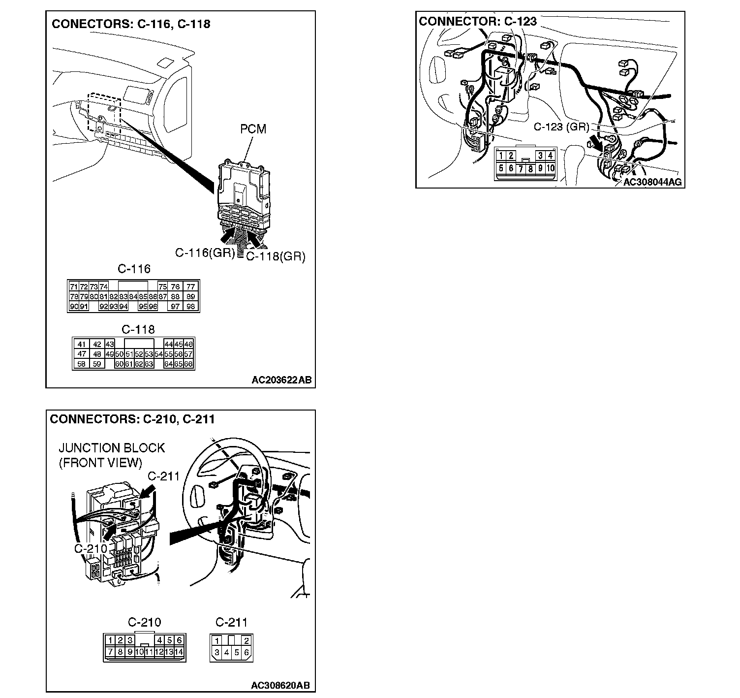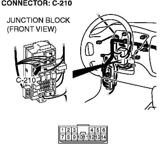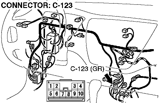 STEP 8. Check intermediate connector C-123 and junction block connector C-210 for loose, corroded or damaged terminals, or terminals pushed back in the connector.