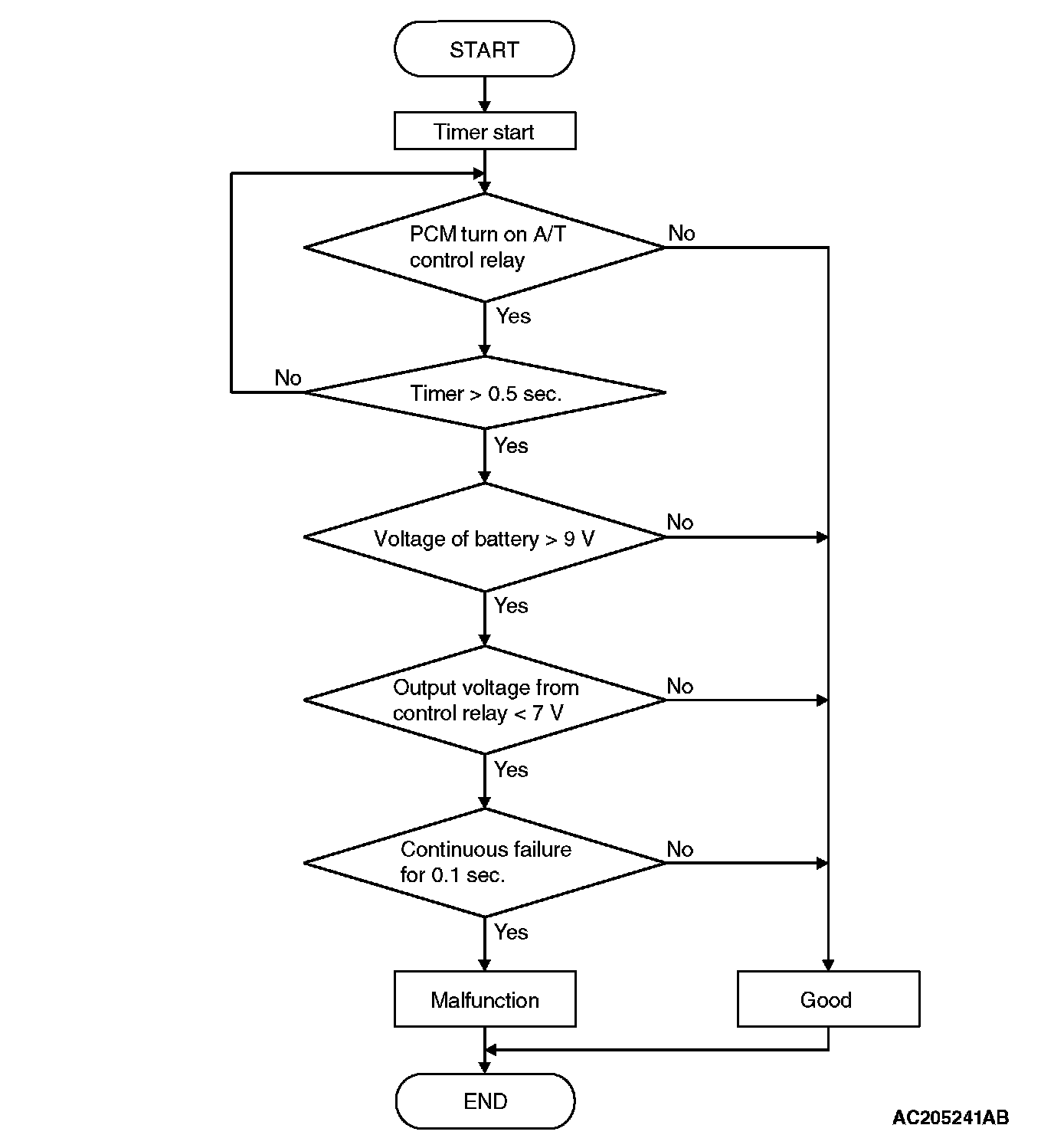 ^ If relay output voltage is below specified value, PCM judges that A/T control relay has a failure.