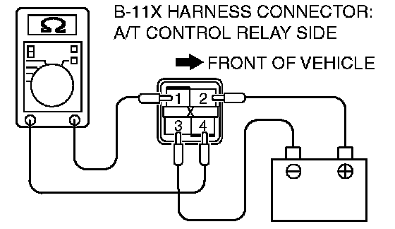 3) Measure the resistance between terminals 1 and 4 of the A/T control relay.