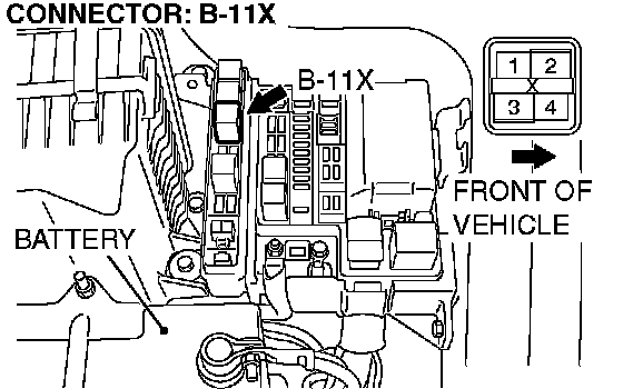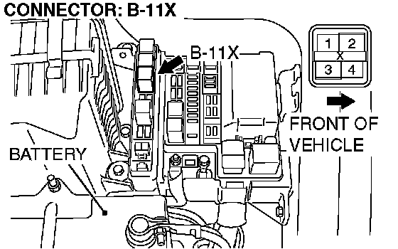 STEP 6. Check the harness for open circuit or short circuit to ground between A/T control relay connector B-11X terminal 1 in the engine component relay box and battery.