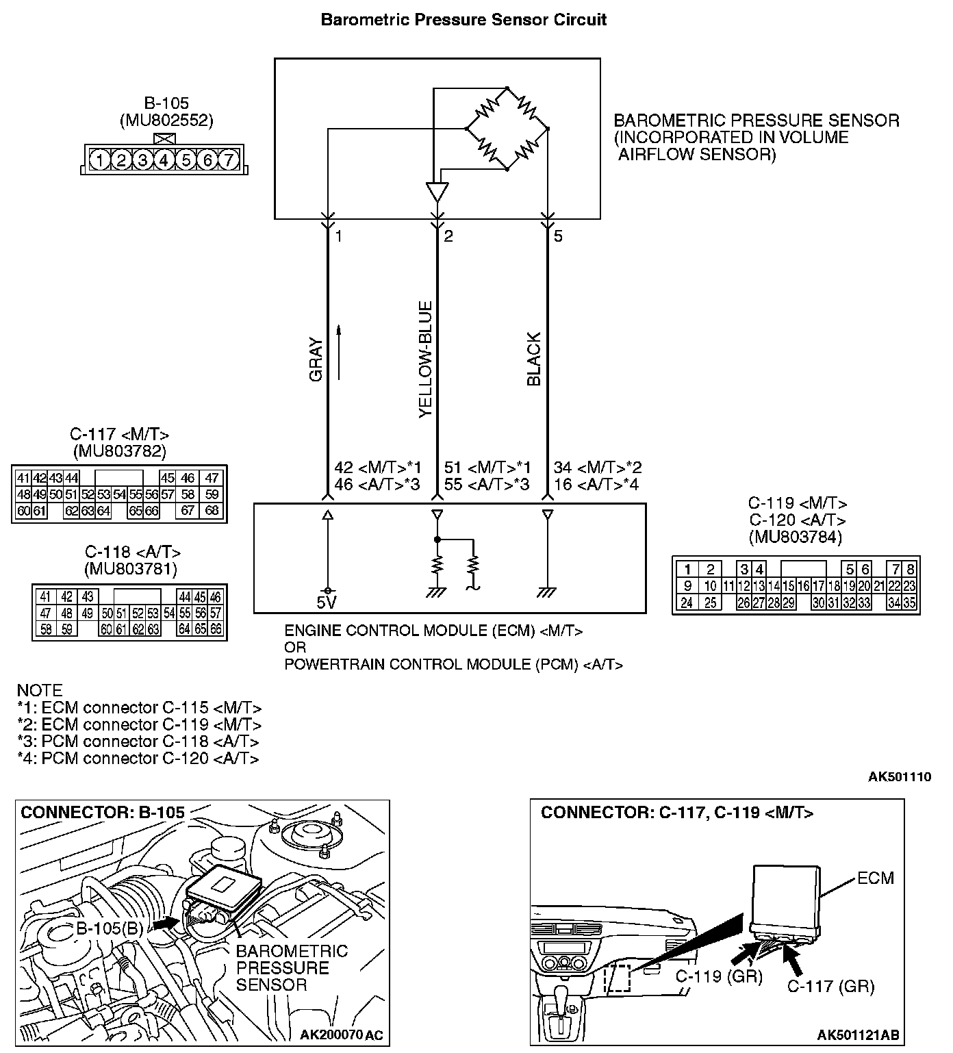 - A 5-volt voltage is supplied to the barometric pressure sensor power terminal (terminal No. 1) from the ECM (terminal No. 42)