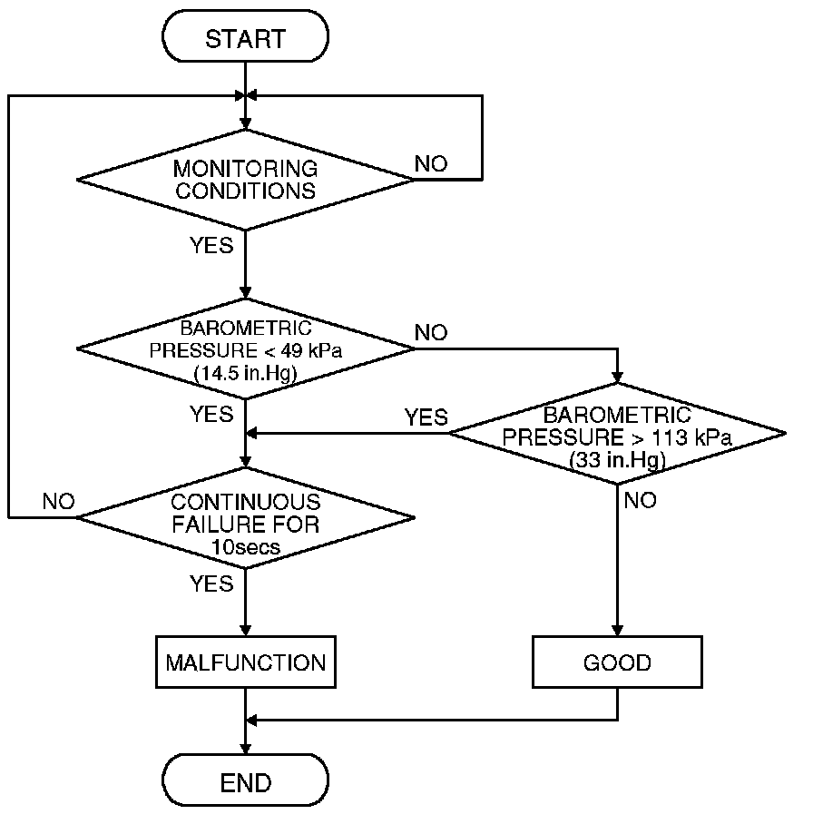 - If the barometric pressure sensor output is out of the actual predictable atmospheric pressure range [lower than 49 kPa (14.5 in.Hg)], a malfunction is determined to have occurred.
