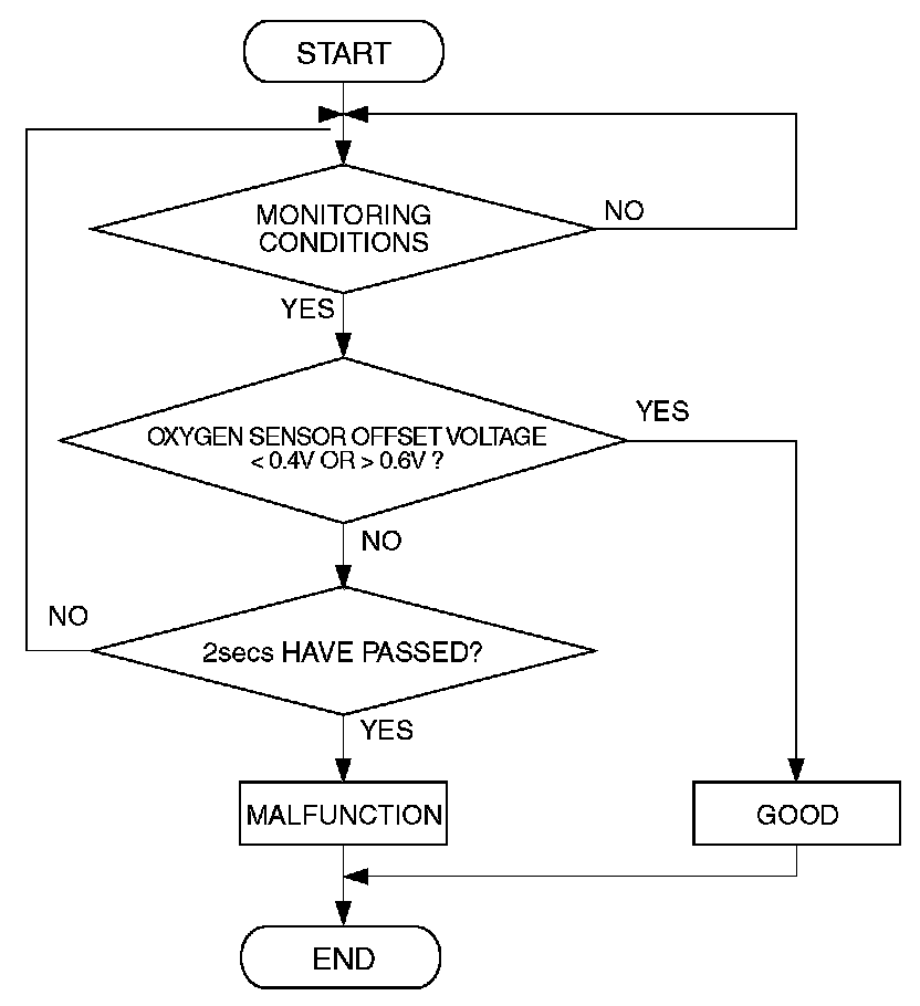 - Heated oxygen sensor offset voltage has continued to be 0.4 volt or lower for 2 seconds.