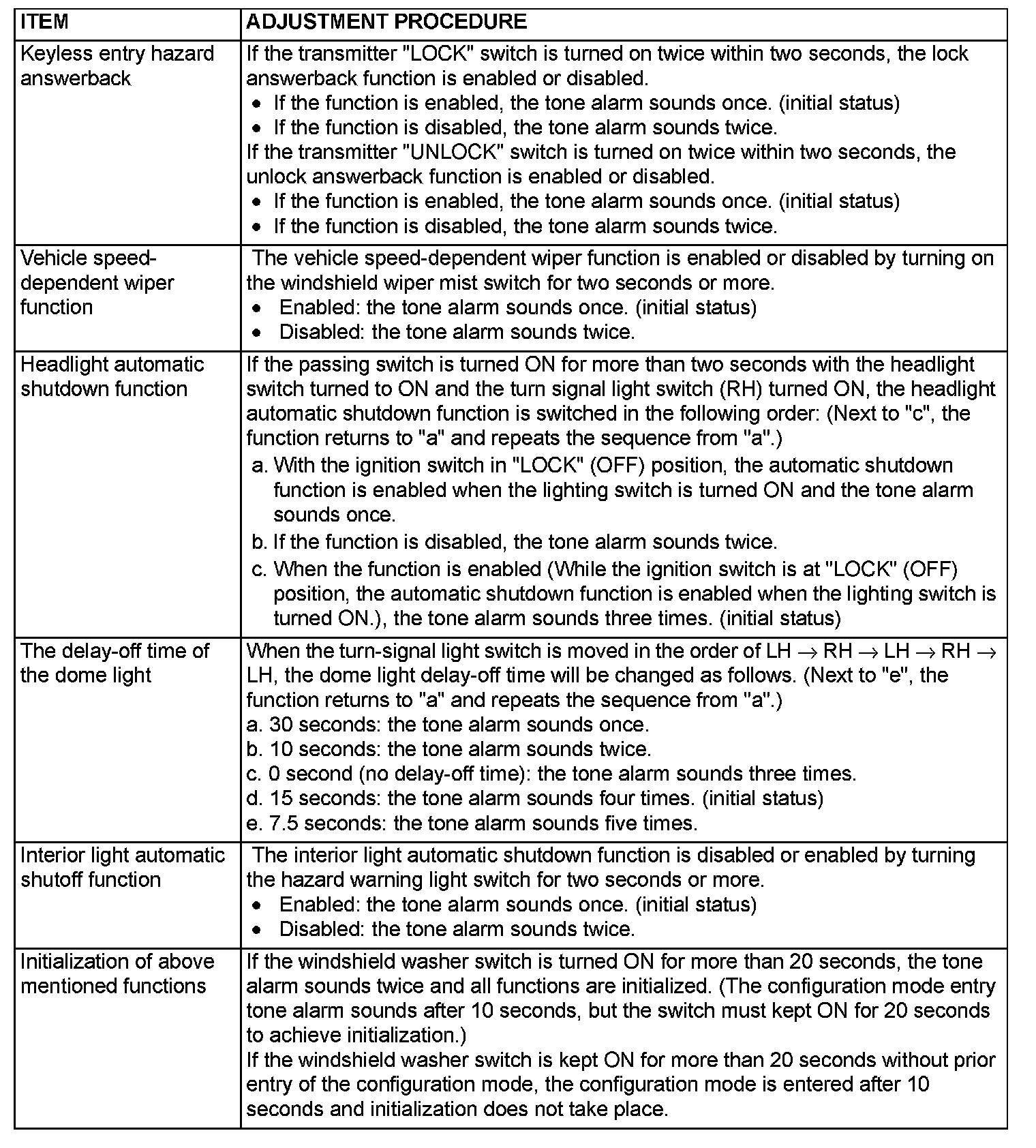NOTE: The keyless entry hazard answerback can be also adjusted by operating the RKE transmitter. (however, this adjustment can be done more easily by operating the transmitter.) Refer to Keyless Entry System - On-vehicle Service - Enabling/disabling the Answerback Function.