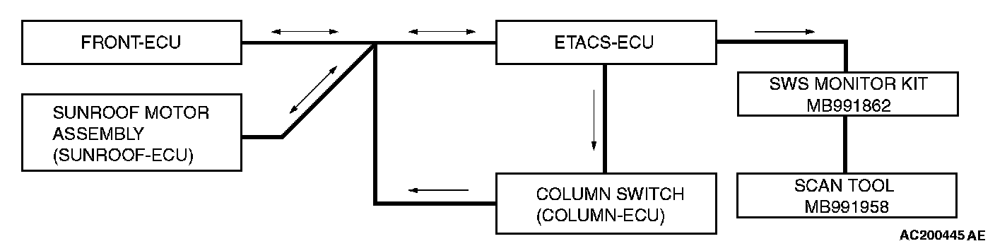 COMMUNICATION METHODAs shown, signal wires used exclusively for transmitting multiplex signal data connect the ETACS-ECU, front-ECU, column switch (incorporating the column-ECU) and sunroof motor assembly (incorporating the sunroof-ECU) and these components communicate with each other.