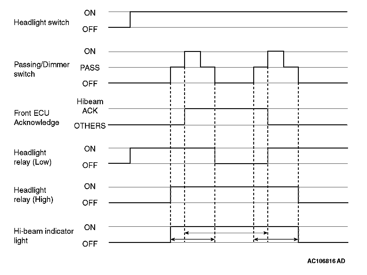 What's more, ETACS-ECU lights up the high beam indicator light when the acknowledgment signal from the front ECU is in the "HI-BEAM ACK" state or the head light switch signal from the column switch is in the "PASS" state.