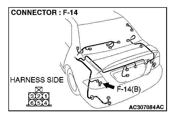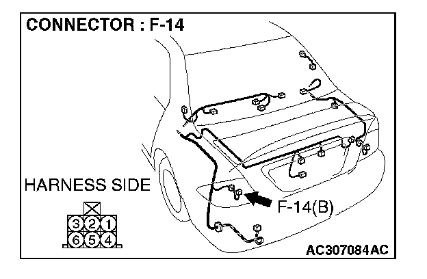 1. Disconnect rear combination light (LH) connector F-14 and measure the resistance available at the wiring harness side of the connector.