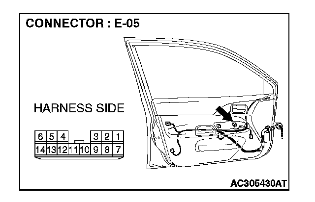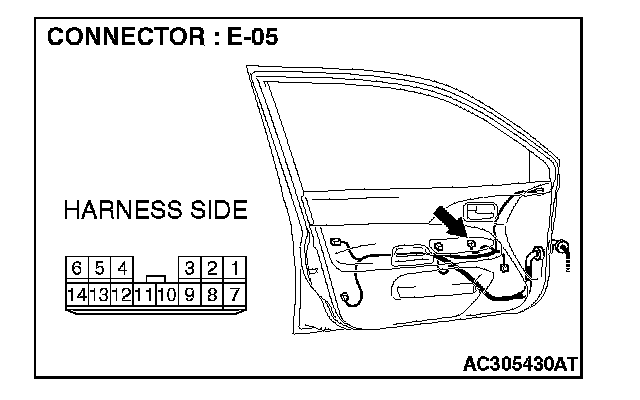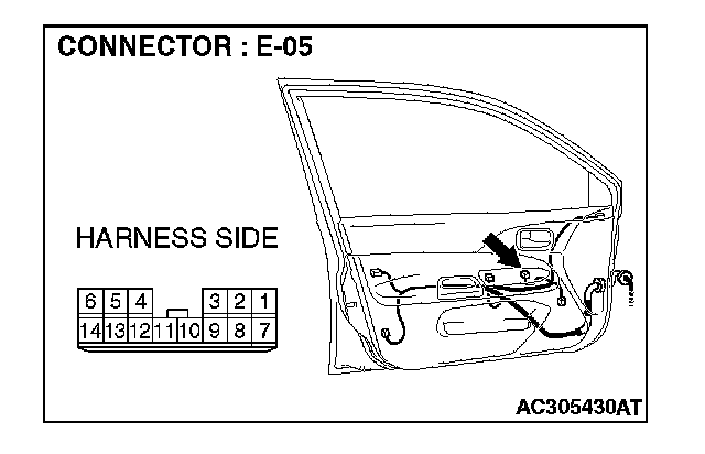 STEP 2. Check power window main switch connector E-05 for loose, corroded or damaged terminals, or terminals pushed back in the connector.