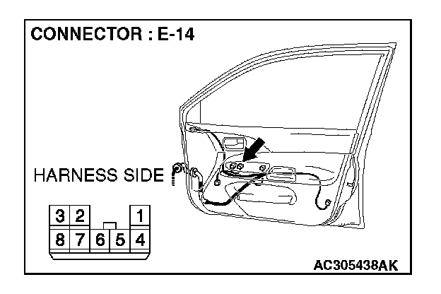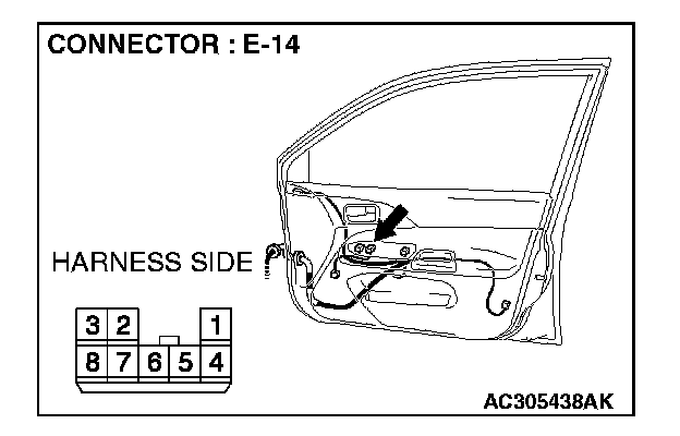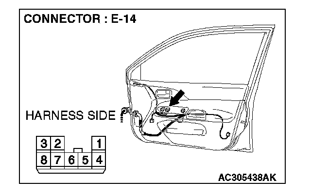 1. Disconnect power window sub switch connector E-14 and measure the resistance available at the wiring harness side of the connector.