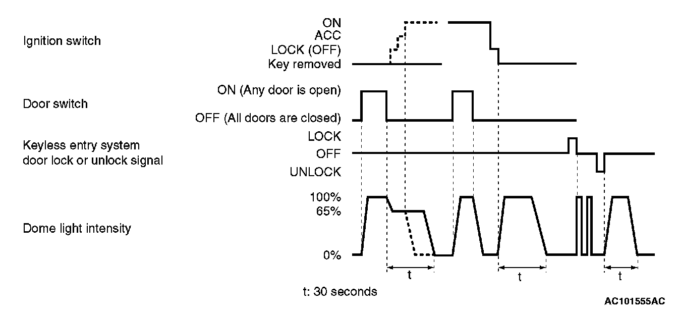 - When a door is opened to get on or get off the vehicle with the ignition switch off, the dome light lights up at a luminance of 100 percent. When a door is closed, the dome light dims at a luminance of 65 percent, and goes off 30 seconds later. However if the ignition switch is turned ON or if all doors are locked while they are closed, the dome light will go off at that point.