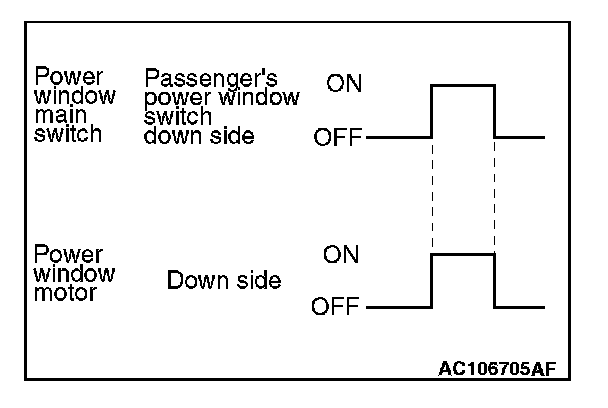 When the passenger's power window switch on the power window main switch is pushed down, the system energizes its respective power window motor, and then passenger's window glass lowers.