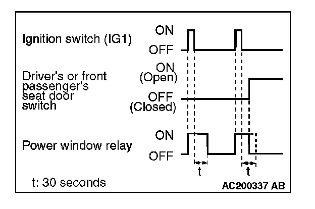 When the ignition switch is turned to the "ON" position, the power window relay is turned ON. After the ignition switch is turned OFF, the system continues to turn ON the power window relay for about 30 seconds and to enable the opening and closing of the door window by the power window switch. When the driver's or front passenger's door is opened while the timer is in operation, the power window relay will be turned OFF