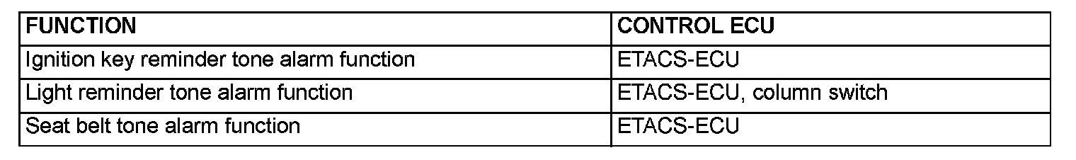 The ETACS-ECU sounds the tone alarm for six seconds if the ignition switch is turned "ON" or "ST" while the seat belt buckle switch (driver's side) is on (the driver's seat belt is not fastened).