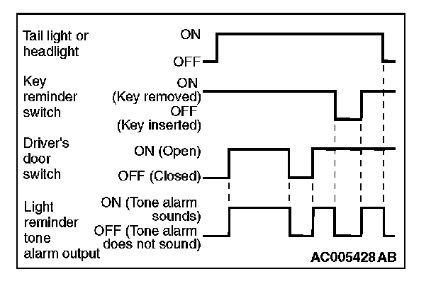 When the taillight or headlight is ON, if the ignition key is removed and the driver's door is opened, a tone alarm will sound continuously to warn that the light is illuminated. However, if the taillight or headlight has been turned off by the headlight automatic-shutdown function, the tone alarm will not sound.