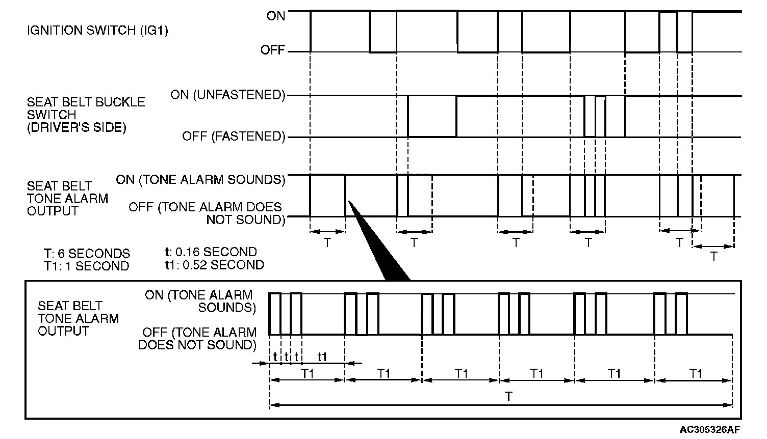 - Sounds the tone alarm for six seconds when the ignition switch is turned "ON" with the seat belt buckle switch (driver's side) on (the driver's seat belt is not fastened) (timer operation).