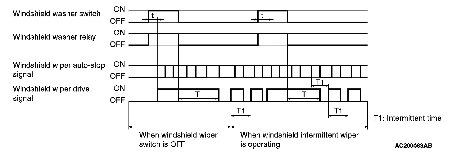 At the point the windshield mist switch is turned ON, if the windshield wiper has been operating intermittently, the same operations as the above will be performed while the windshield mist wiper switch is ON. After the windshield mist wiper switch goes OFF, the intermittent operations will be set again T1 seconds after the windshield wiper auto-stop signal is turned ON last.