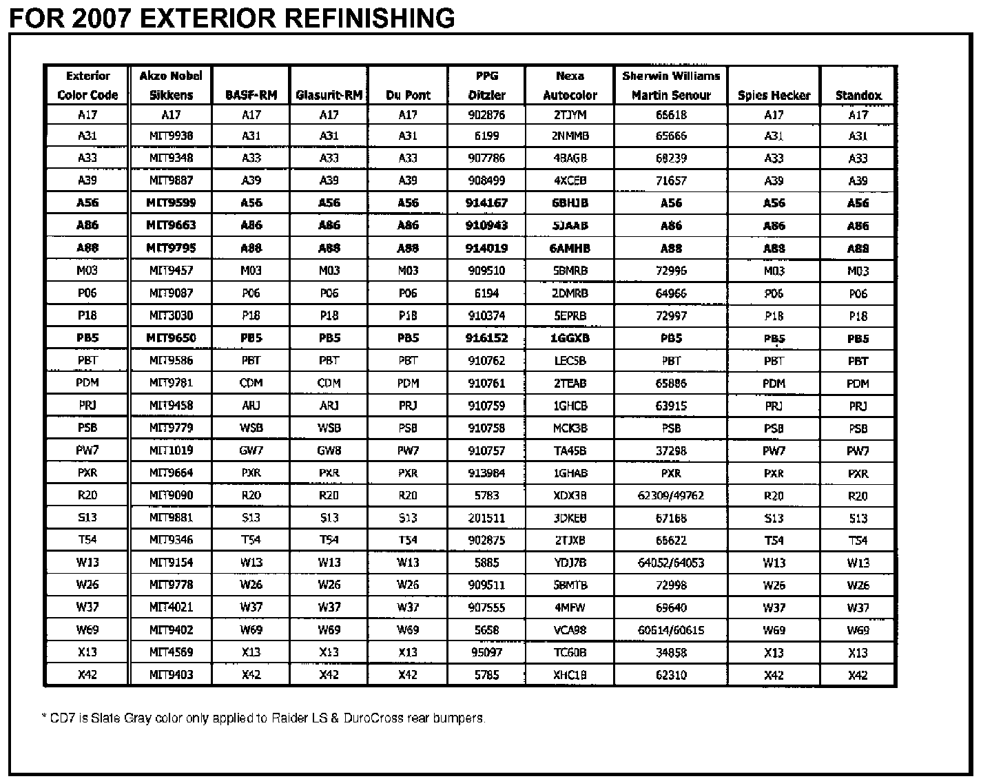 2007 EXTERIOR COLOR CODES AND MODEL APPLICATIONS