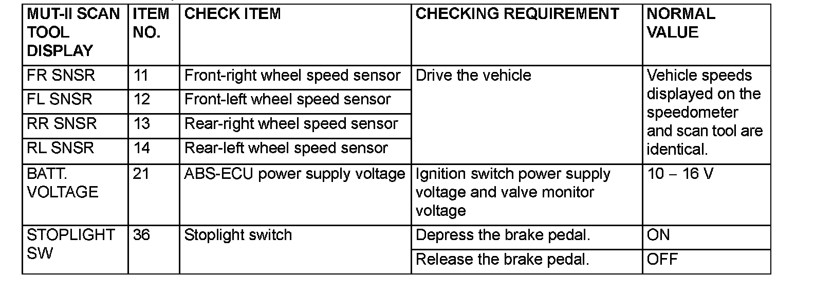 The following items can be read by the scan tool from the A ABS- ECU 1 input data.