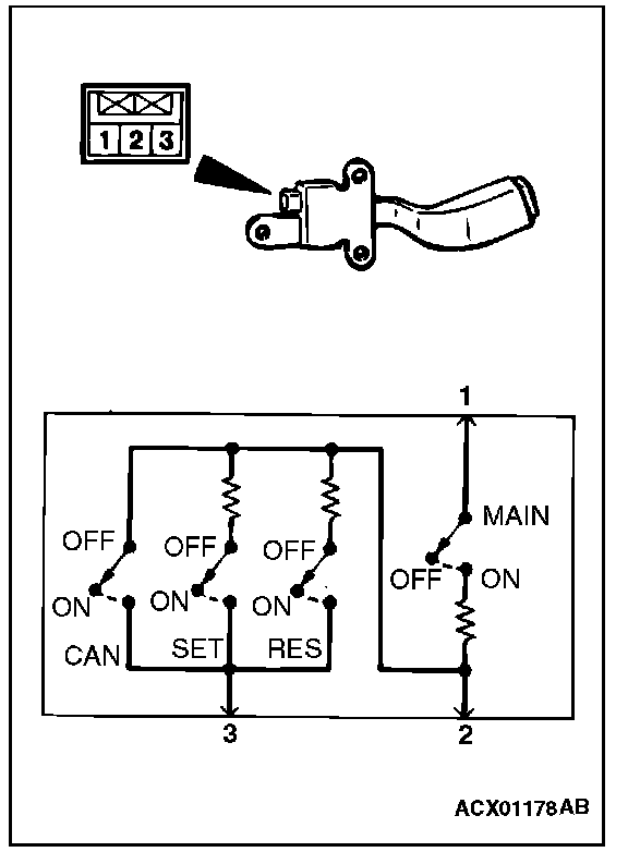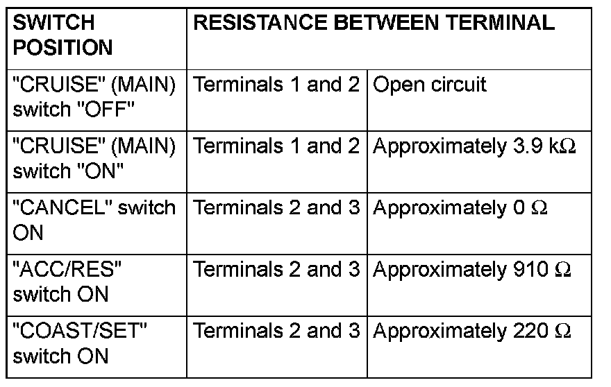 AUTO-CRUISE CONTROL CHECKMeasure the resistance between the terminals when each of the "COAST/SET", "ACC/RES", "CANCEL" and "CRUISE" (MAIN) switches is pressed. If the values measured at the time correspond to those in the table, the resistance values are correct.