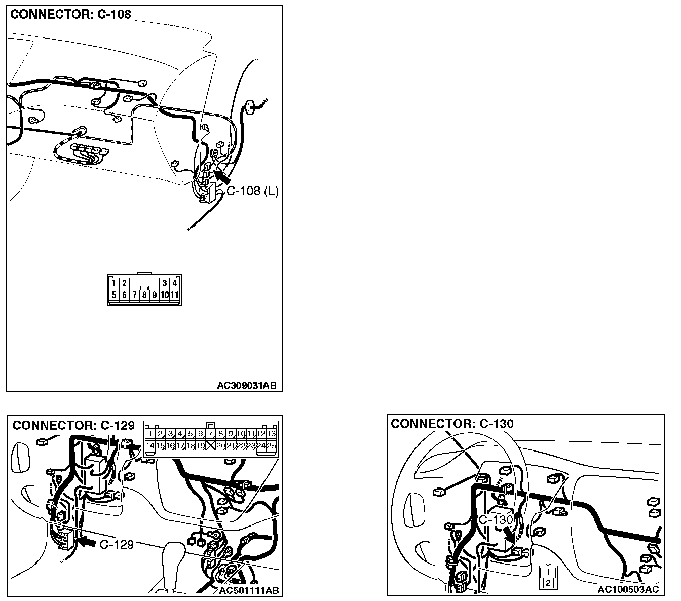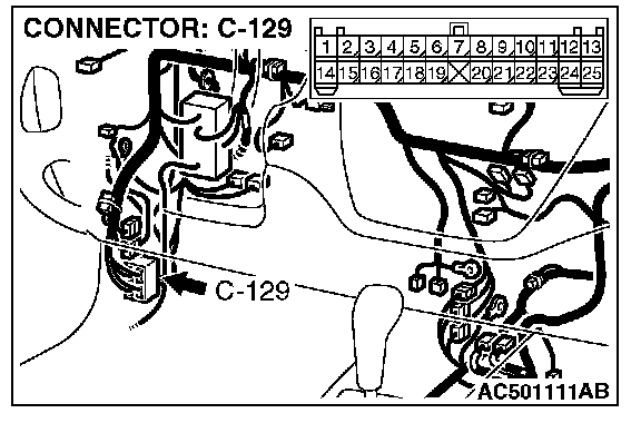 STEP 3. Check clutch pedal position switch connector C-130, auto-cruise control-ECU connector C-107, intermediate connectors C-108 and C-129 for loose, corroded or damaged terminals, or terminals pushed back in the connector.