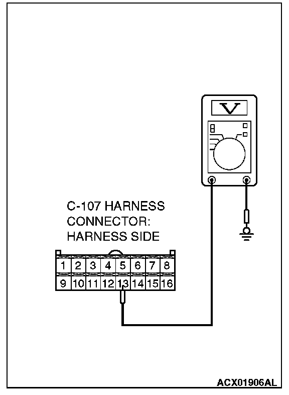 4. Measure the voltage between auto-cruise control-ECU connector C-107 terminal 13 and ground by backprobing.