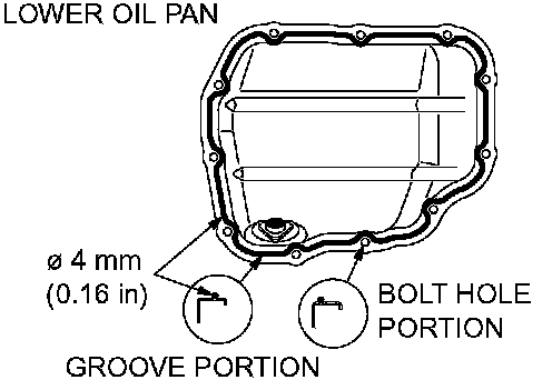 2. Apply a 4 mm (0.16 inch) diameter bead of sealant Mitsubishi Genuine Parts number MD970389, or equivalent to the upper oil pan and lower oil pan.
