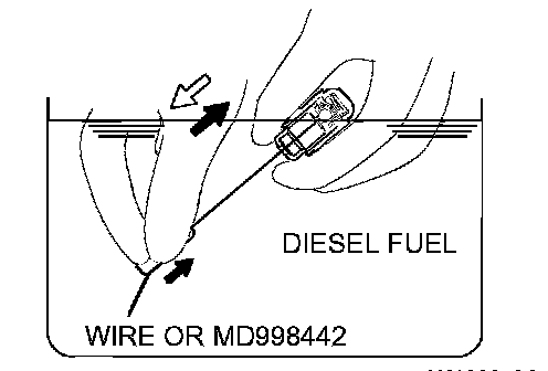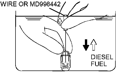 3. While gently pushing down the internal steel ball using wire [0.5 mm (0.020 inch) in diameter] or special tool MD998442, move the plunger through 5 to 10 strokes until it slides smoothly. In addition to eliminating stiffness in the plunger, this operation will removed dirty oil.