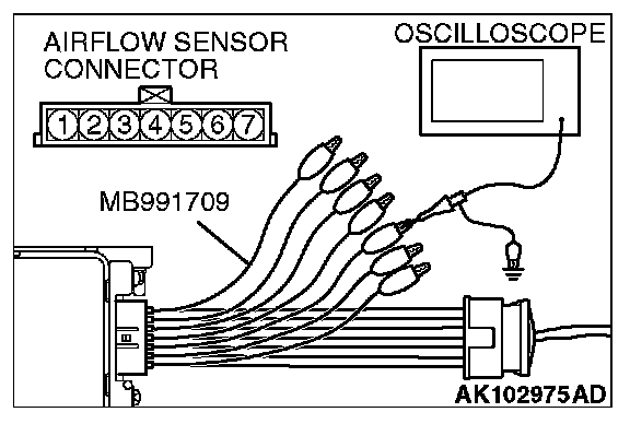 1. Disconnect the volume airflow sensor connector, and connect the test harness special tool (MB991709) in between. (All terminals should be connected.)