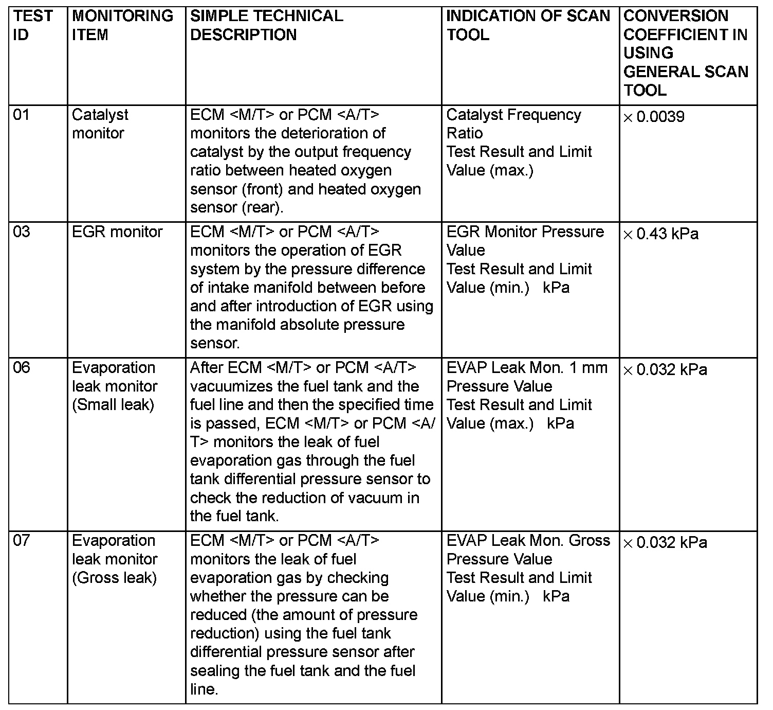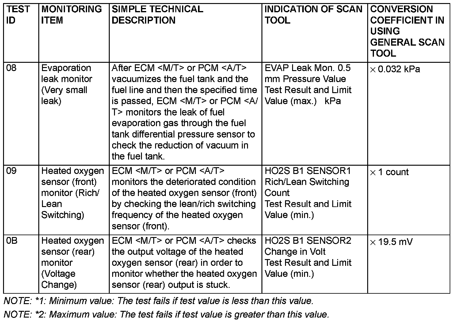By selecting MODE 6 using scan tool, Test Result and Limit Value (minimum) *1 or (maximum) *2 about the main items of emission control system which ECM or the PCM