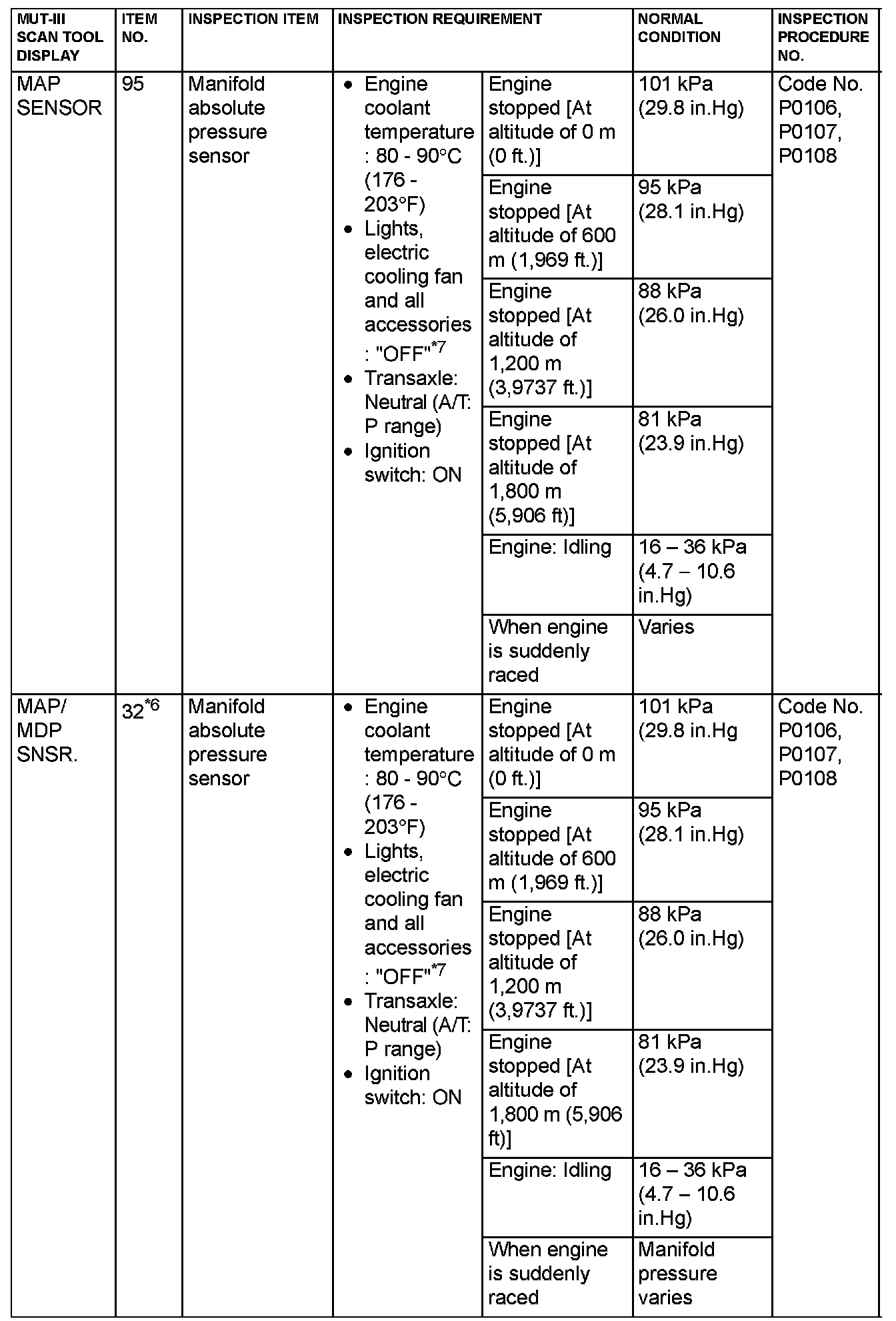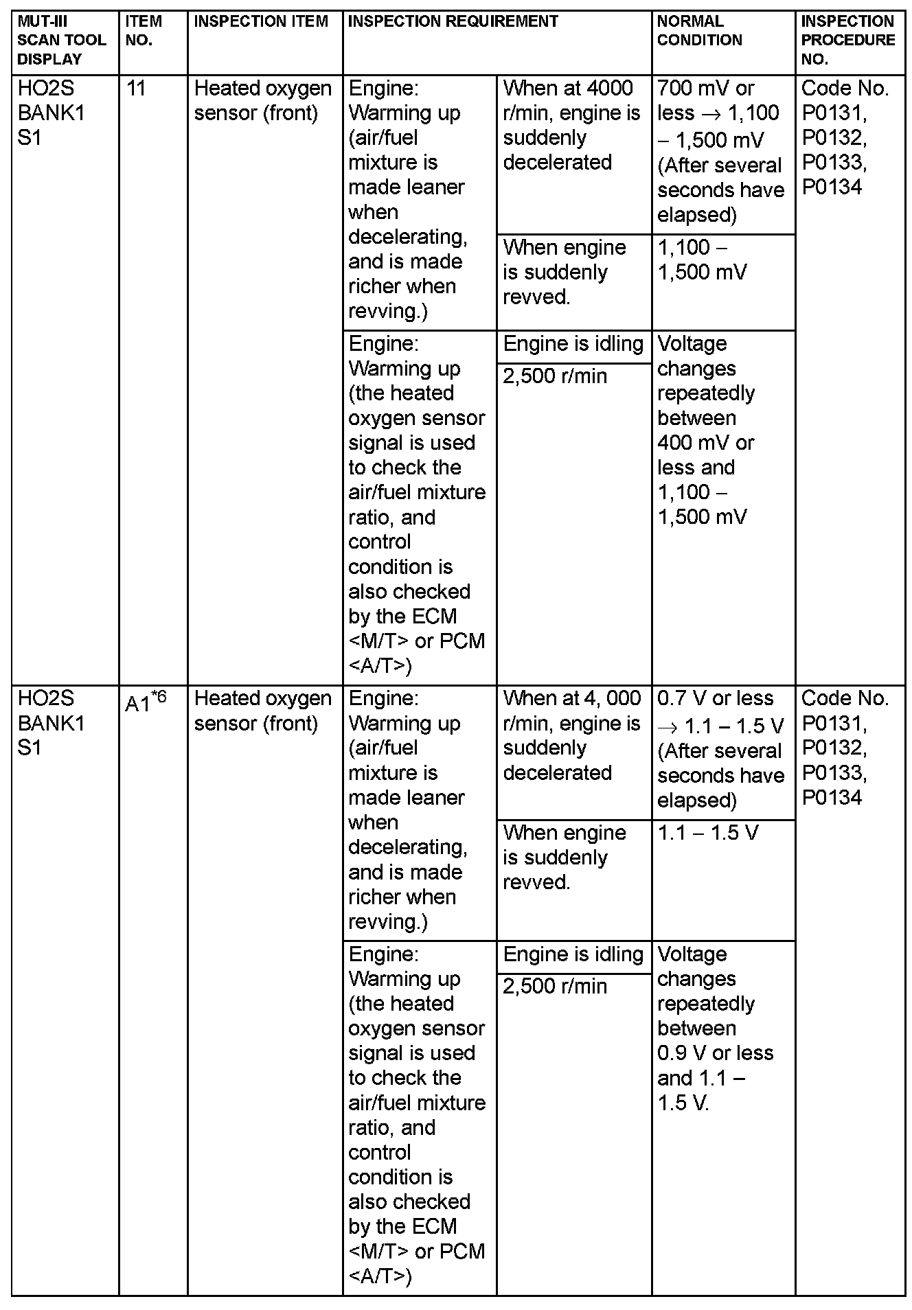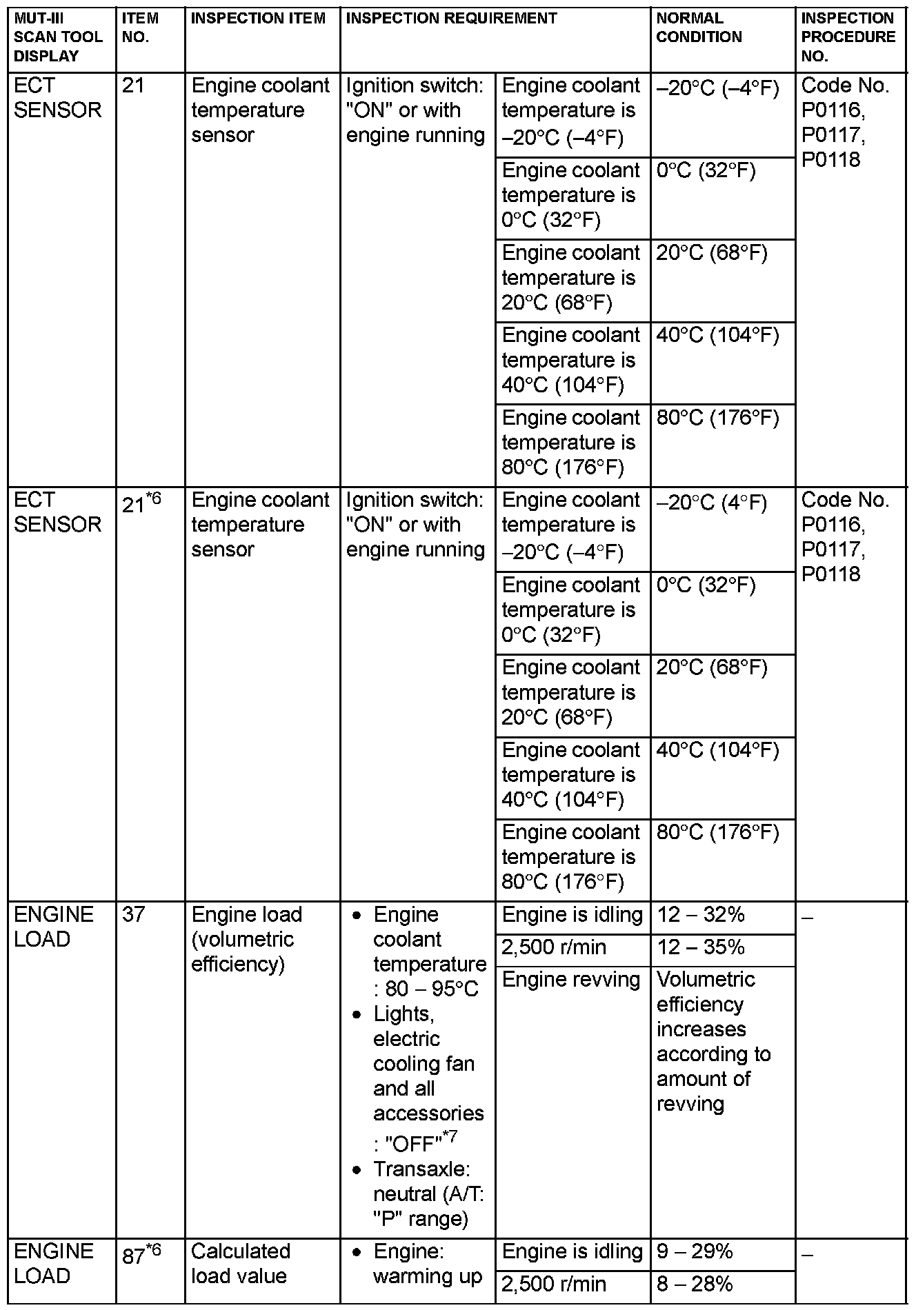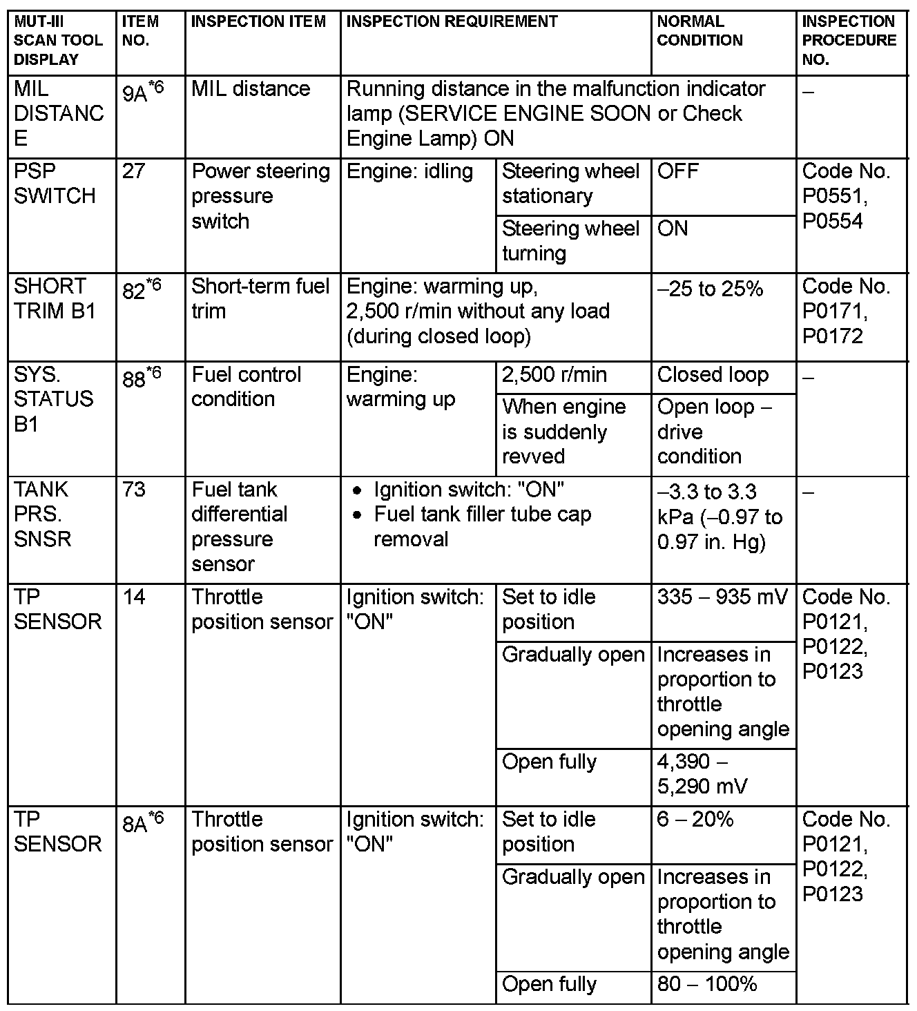 NOTE: *6: GST items. [Data list items consist of MUT-III items and GST items. GST items can be accessed through the use of a general scan tool (GST). When scan tool MB991958 (MUT-III sub assembly) is used, MUT-III items appear alphabetically; then, GST items appear alphabetically. The black and white characters of the GST items are inverted from the MUT-III items.]