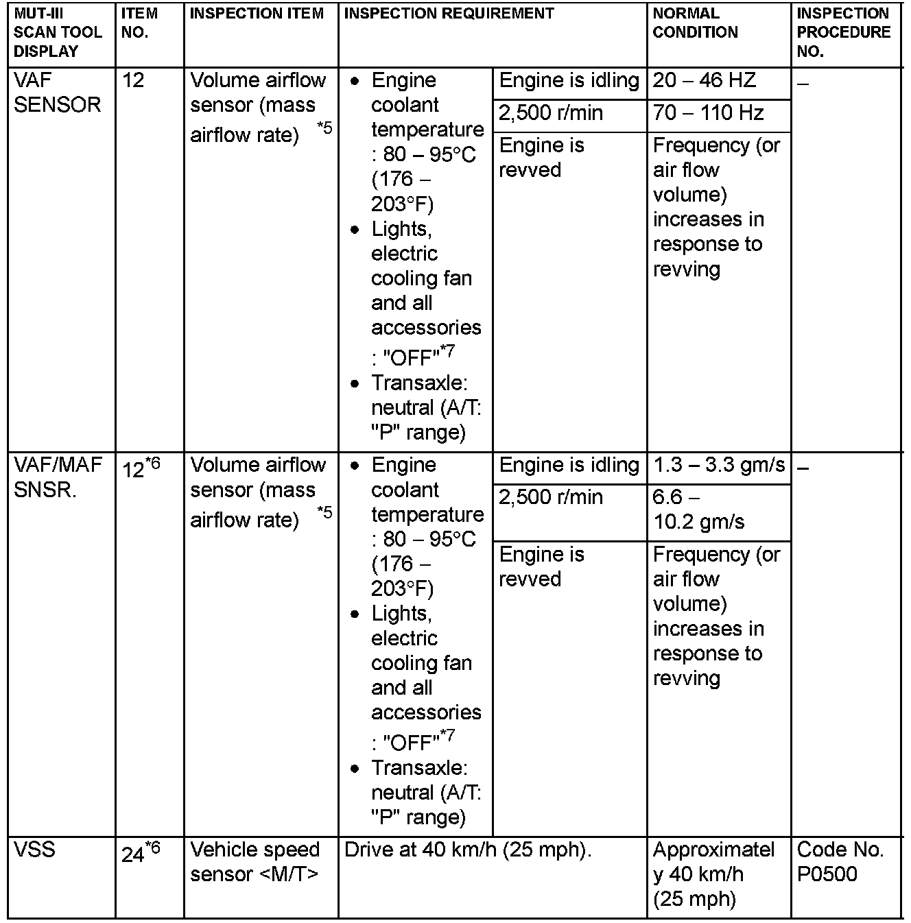 NOTE: *5: In a new vehicle [driven approximately 500 km (311 mile) or less], the volume airflow sensor output frequency is sometimes 10% higher than the standard frequency.