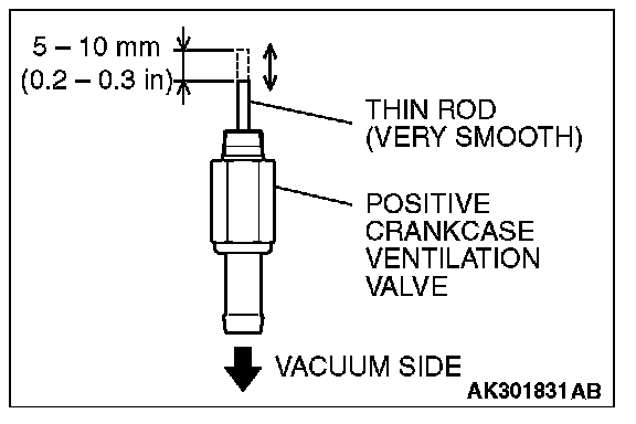 1. Hold the positive crankcase ventilation (PCV) valve with the vacuum side down. Insert a thin rod, and using light pressure, depress the end of the PCV valve spring by 5 - 10 mm (0.2 - 0.3 inch). Release pressure on the rod to see if the PCV valve spring will lift the rod to its original position.
