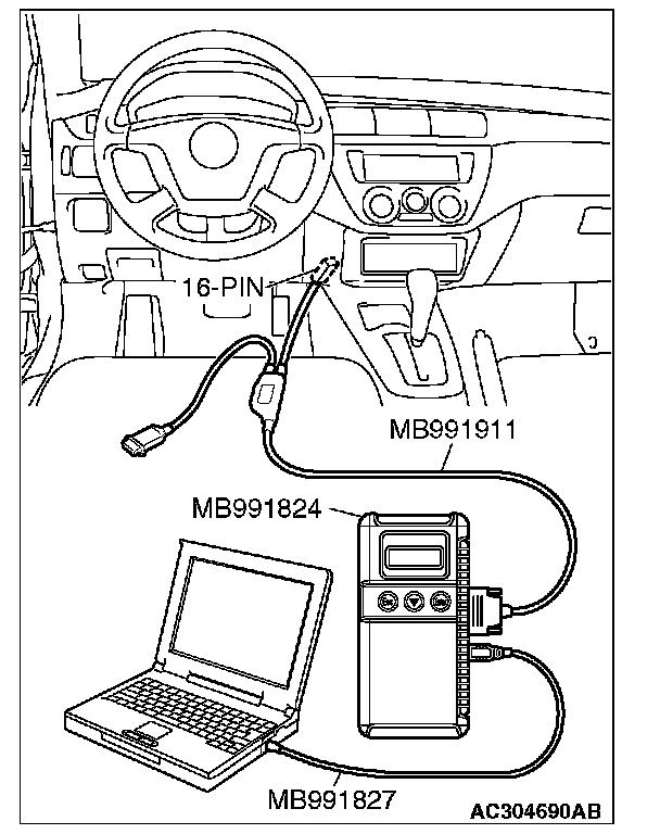 CAUTION: To prevent damage to scan tool MB991958, always turn the ignition switch to the "LOCK" (OFF) position before connecting or disconnecting scan tool MB991958.