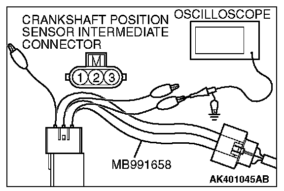 3. Disconnect the crankshaft position sensor connector, and connect the test harness special tool (MB991658) in between. (All terminals should be connected.)