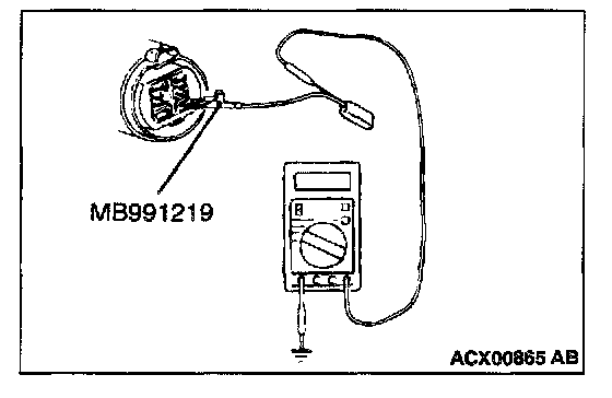 WARNING: Insert the backprobing tool into the connector from the harness side, and connect the tester to the backprobing tool. If any tool other than the backprobing tool is used, it may cause damage to the harness and other components. Furthermore, measurement should not be carried out by touching the backprobing tool directly against the terminals from the front of the connector. The terminals are plated to increase their conductivity, so that if they are touched directly by the backprobing tool, the plating may break, which will decrease reliability.