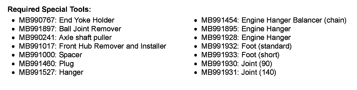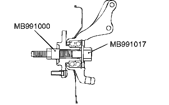 CAUTION: Do not apply pressure to the wheel bearing by the vehicle weight to avoid possible damage when the drive shaft is removed. If, however, vehicle weight must be applied to the bearing in moving the vehicle, temporarily secure the wheel bearing by using special tools MB991017 (front hub remover and installer) and MB991000 (spacer).