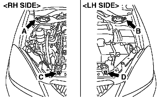1) Set special tool MB991895 (engine hanger) to the front fender assembling bolts (A and B) and radiator support upper insulator attaching bolts (C and D) as shown.