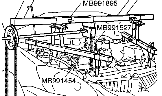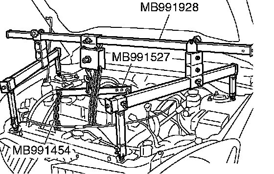 2) Set special tool MB991527 (hanger) and MB991454 (chain) to hold the engine/transaxle assembly.