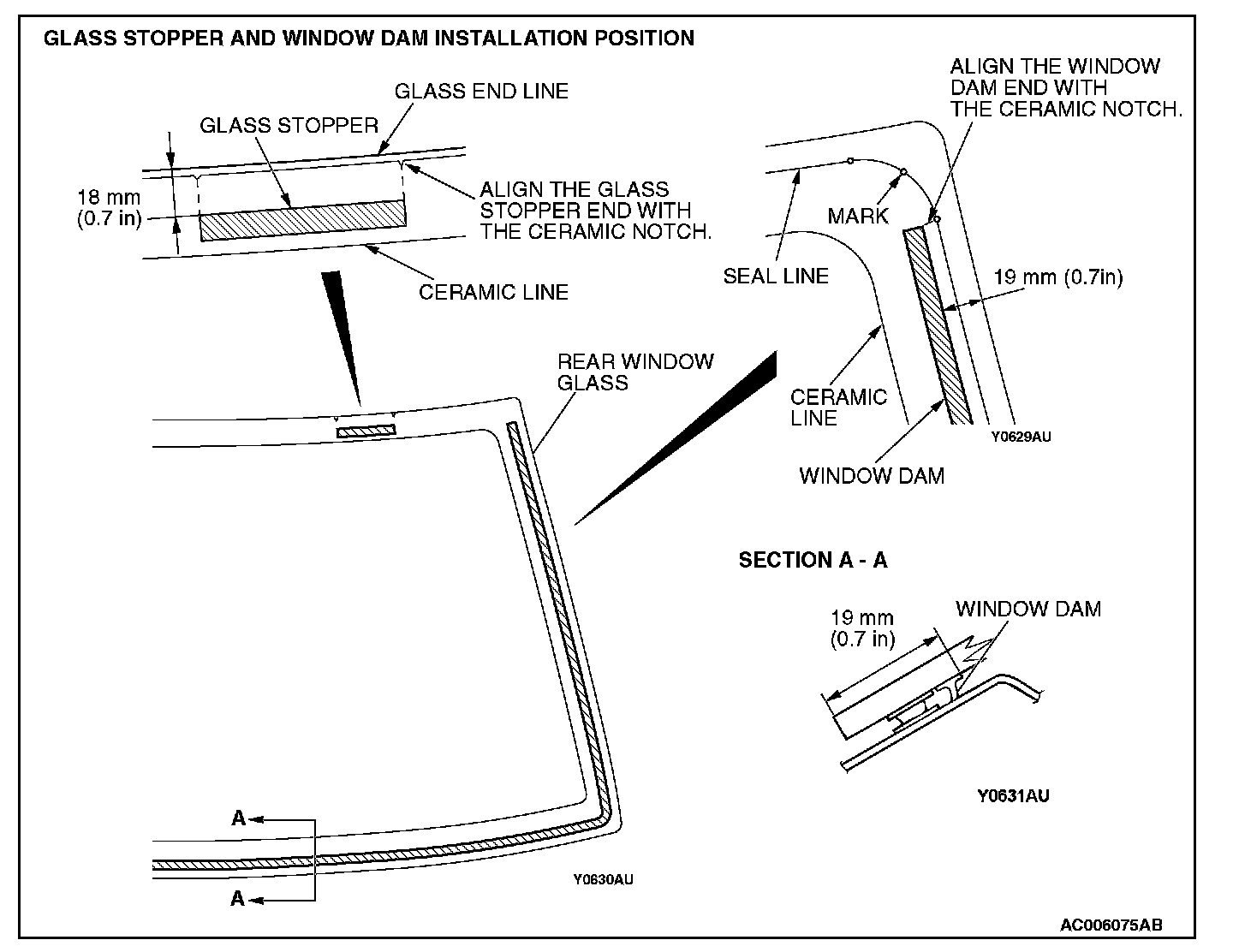 5. Install the glass stopper and window dam to the specified positions so that there are no adrift or bent surfaces inside the rear window glass.