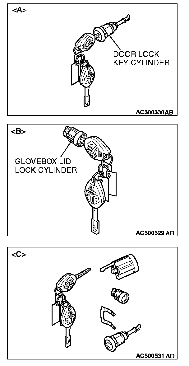 - Do not register the ignition keys other than the ignition key that starts the engine. (When replacing by the door lock key cylinder of illustration or the glove box lid lock cylinder of illustration , the engine cannot start if the encrypted code is registered with the bar code on the ignition key supplied simultaneously. If the ignition key using for each lock cylinder and starting engine is used as a common ignition key, replace by the key set of illustration