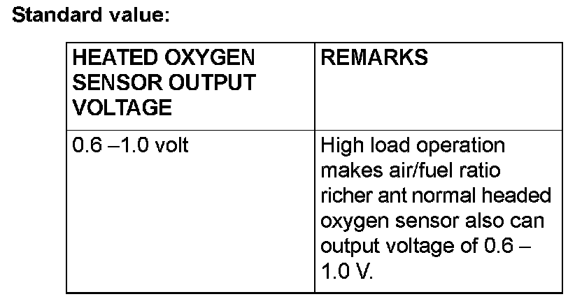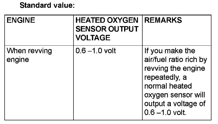 NOTE: If the sufficiently high temperature [of approximate 400 °C (752 °F) or more] is not reached although the heated oxygen sensor is normal, the output voltage would be possibly low although the rich air/fuel ratio.
