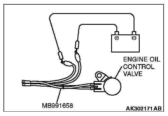 2. Check that the operation sound of the engine oil control valve can be heard when the positive battery voltage is supplied to the engine oil control valve. (Use the jumper wires to connect terminal No. 2 of the engine oil control valve connector to the positive battery terminal and terminal No. 1 to the negative battery terminal.)