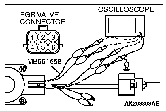 2. Connect the oscilloscope probe to the EGR valve connector terminal No. 1, terminal No. 3, terminal No. 4, terminal No. 6 respectively.